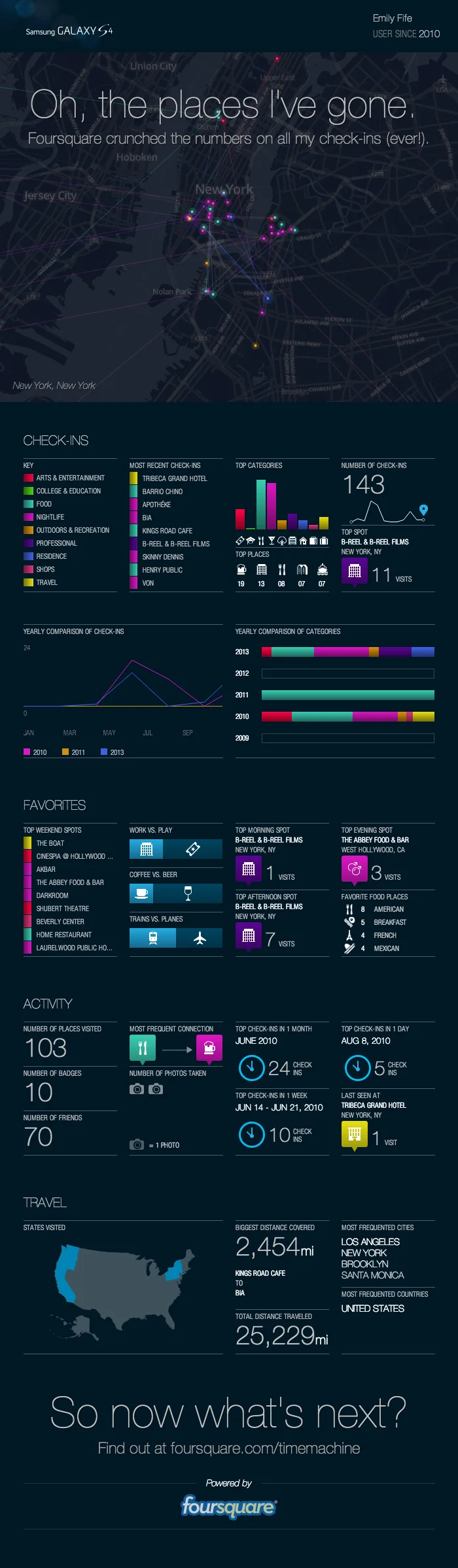 As a sharable take away the experience generates a beautiful custom infographic of all your check-ins and stats.